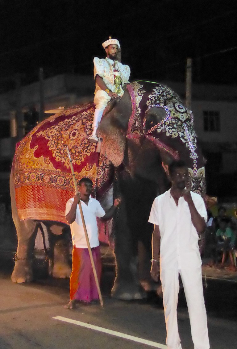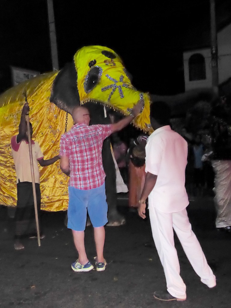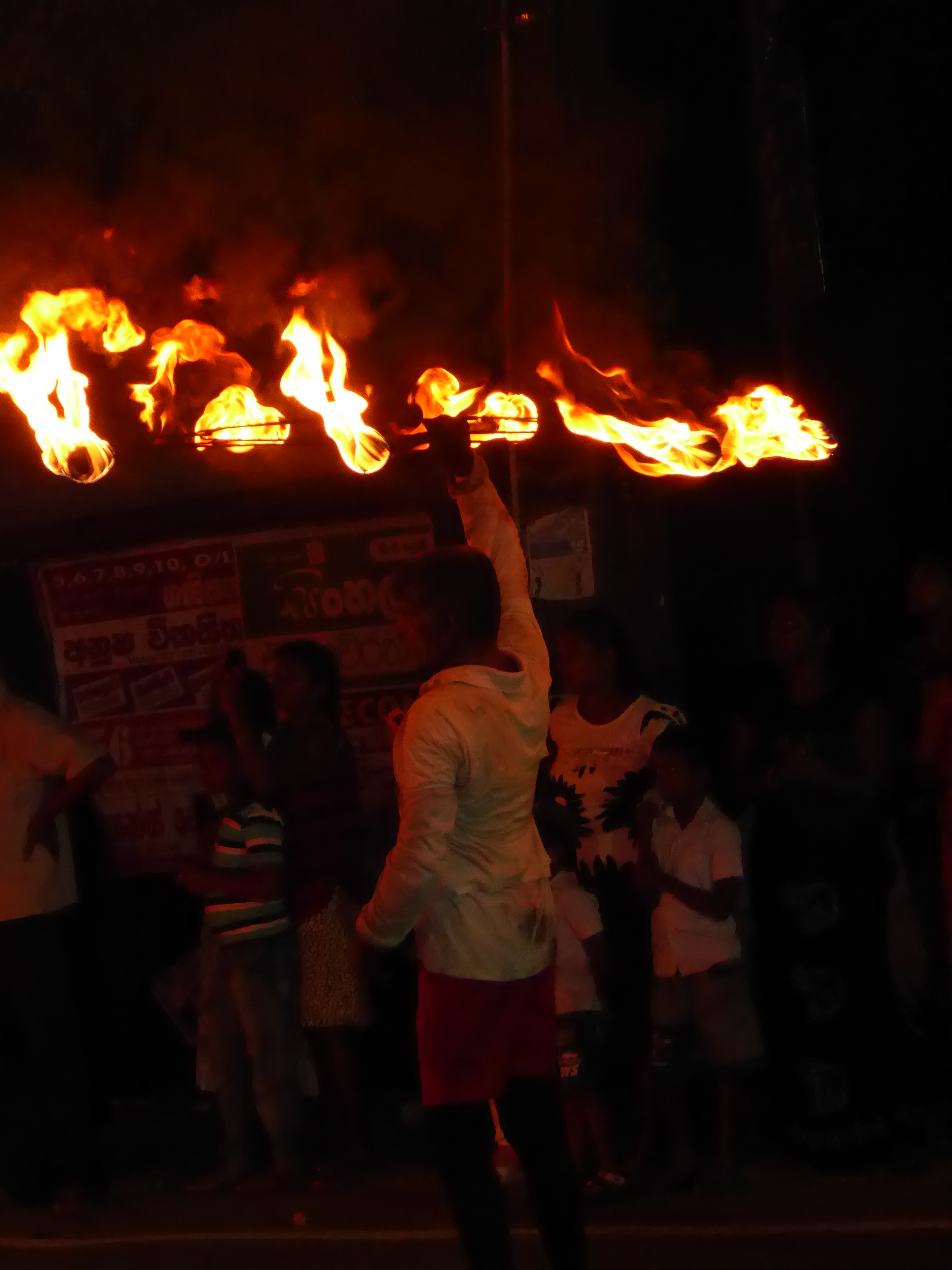 Und abends direkt ein HIghlight: Parade zum Vollmondfest (auch wenn gerade Halbmond ist). Auf der Hauptstraße tanzen aufwändig kostümierte Kindergruppen, vorneweg kommen Jungs und Männer mit Peitschen, die wild knallen und danach unerschrockene junge Männer, die Räder mit Feuer schwingen. Zwischendurch immer wieder blinkende Wagen mit Buddha-Statuen. Und dann mein Highlight: majestätische Elefanten – geschmückt, weise, stolz.
