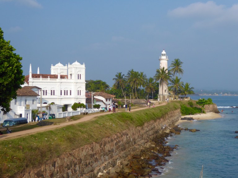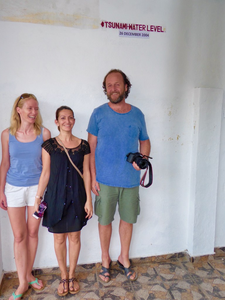 Fort Galle – Erbe der Holländer. Ein massives Bollwerk gegen das Meer mit einer kleinen Siedlung, zauberhaften, kolonialen Gassen, vielen kleinen Lädelchen und Cafés. Definitiv eine Reise wert (Araber, Portugiesen und nicht zuletzt die Oranje-Nachbarn und die Briten fanden das übrigens auch). Die  handgemachten Mauern des Forts sind so hoch, dass sie das Städtchen sogar vor der zerstörerischen Kraft des Tsunami bewahrt haben. Irgendwie schon erstaunlich, denn auf der Fahrt von Beruwela in den Süden, ist der Tsunami von 2004 noch sehr präsent. Memorials, verlassene, zerstörte Häuser, neue Häuser wie es scheint alle aus derselben Bauzeit und viele, viele Geschichten über Tod, Zerstörung, Glücksfälle des Überlebens. Bei einer Seidenfabrik, bei der wir Halt machen und sehen wie Seide u.a. mit „aufgebrezelt“ für Loden Frey produziert wird, sehen wir die Markierung, wie hoch das Wasser auch hier war.