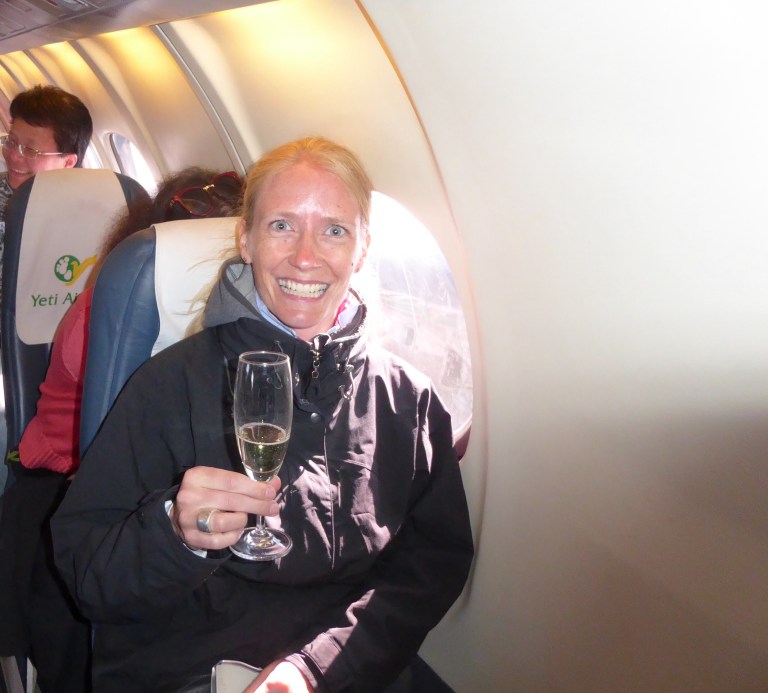 Und dann dies: ein Flug zum Everest. Nur Berge sehen? Weit gefehlt. Die Magie dieser Bergwelt ist deutlich zu spüren. Und es ist einfach nicht zu fassen, wirklich am Dach der Welt zu sein. Mit einem kleine Sektchen ist das Feiern dieses Moments einfach nicht mehr zu toppen.