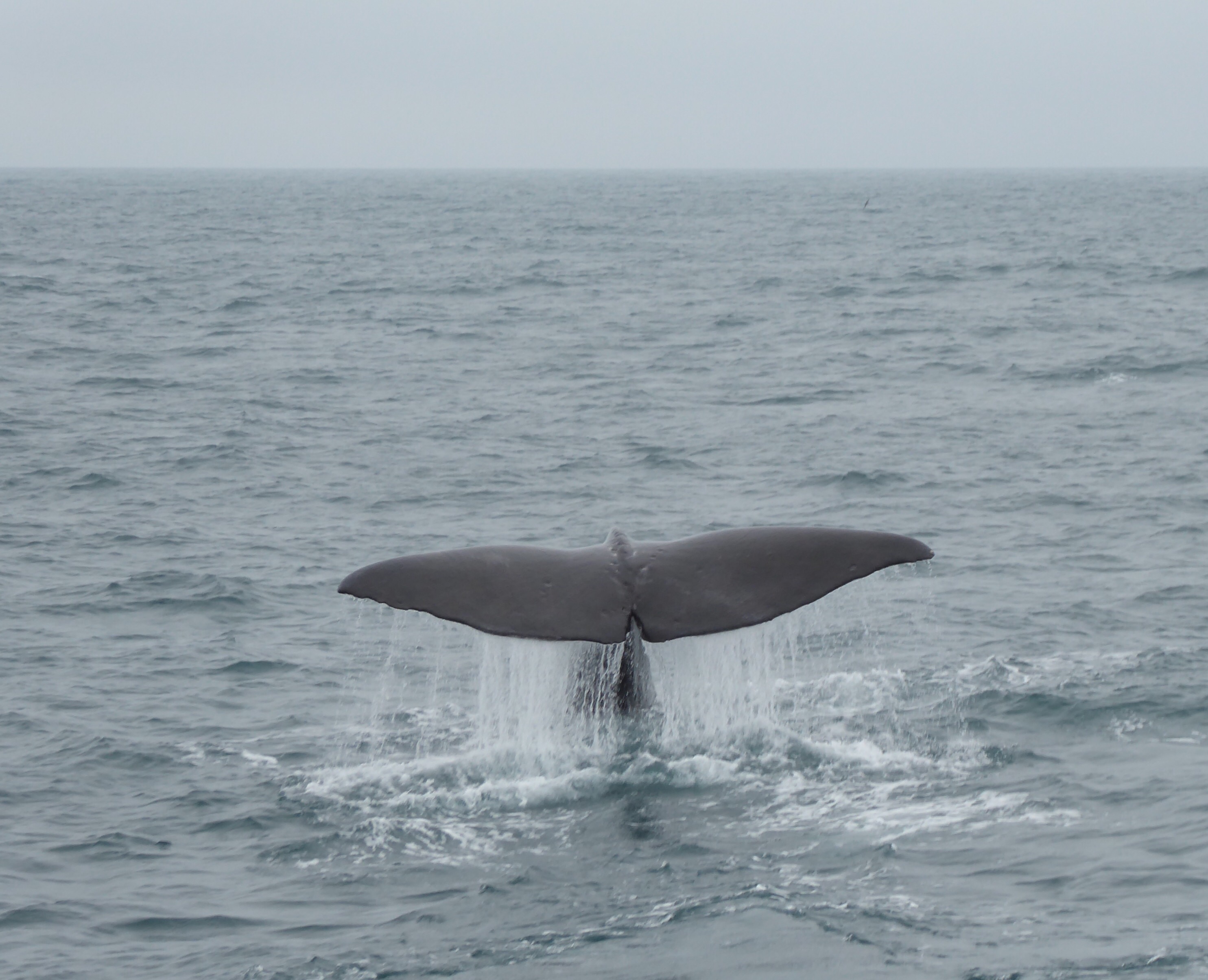 Den Gegenpol zu den Delfinen bildet für mich der Sperm Whale. Ruhig liegt er kurz unter der Wasseroberfläche. Er atmet. Mehr nicht. Scheinbar. Einige Minuten lang. Immer wieder pustet er Wasserfontänen nach oben. Stäubt die Seeluft mit Wasser ein. Dann ein letzter Atemzug. Tief. Erkennbar anders. Dann taucht er ab. Und zeigt seine wunderschöne Schwanzflosse. Majestätisch – der Herrscher der Meere-, gigantisch und groß. Was für ein Erlebnis.