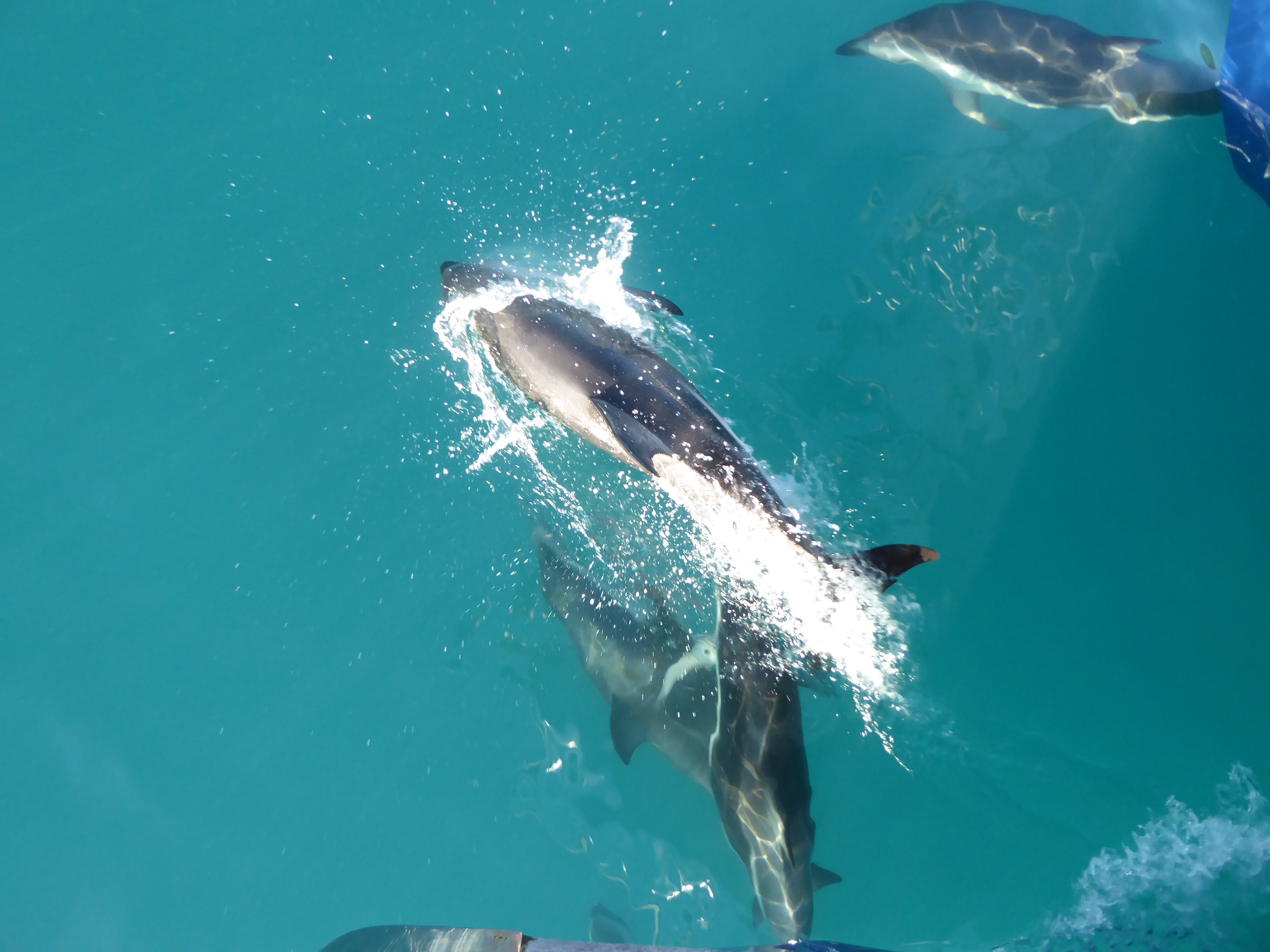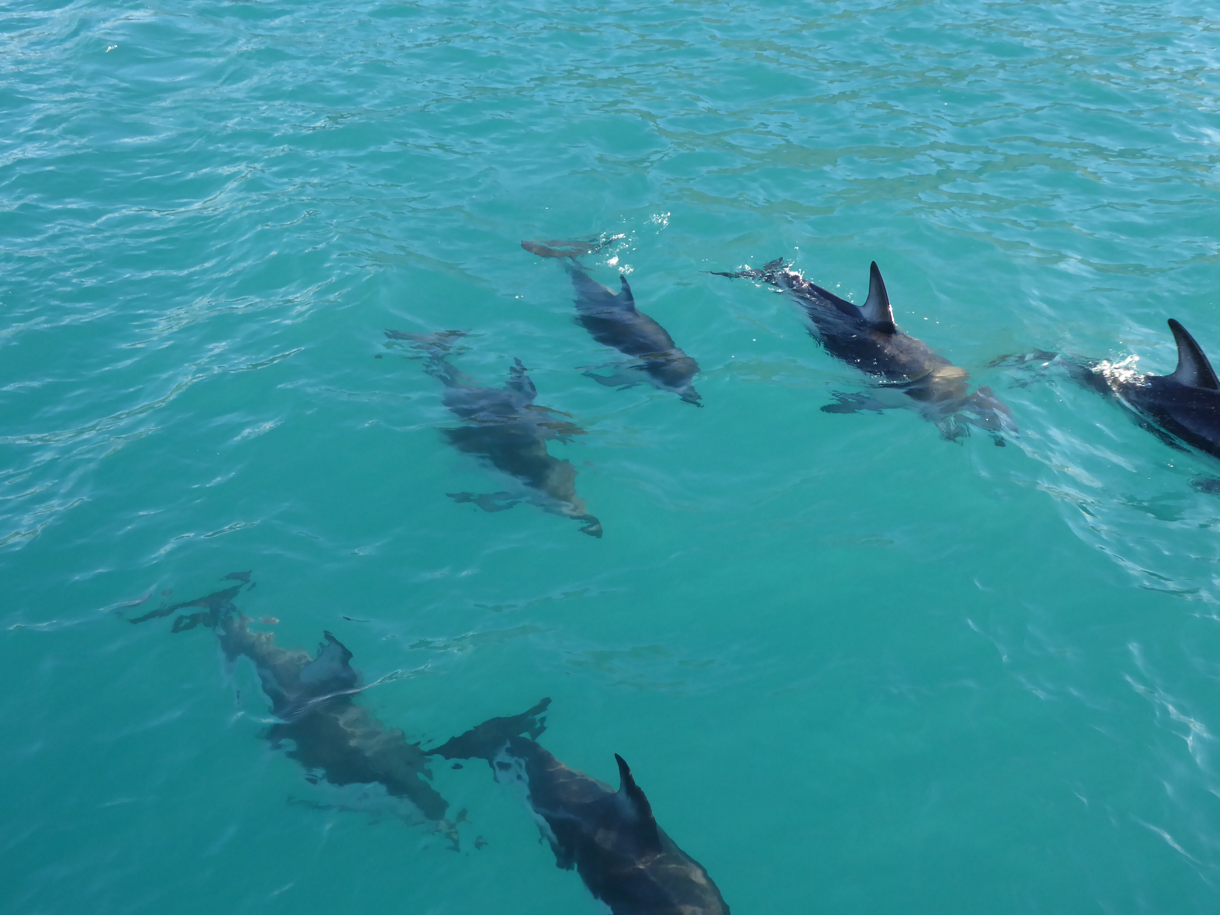 BTW: Was in meinem Traum allerdings definitiv anders war: ich schwamm im Bikini in kristallklarem, türkisenem, wohlig-warmem Wasser. Realität: ich schwimme im dicksten Neoprenanzug eingepackt, an Füßen und Händen schlotternd durch türkisfarbenes Wasser, das mich allerdings nicht weit sehen lässt, sondern dunkel ist und nur die nahen Delfine zur Sicht freigibt. Das Wasser ist so kalt, dass ich trotz aller Schutzkleidung echt Mühe habe, ruhig zu atmen. So wird das Schnorcheln irgendwie eine Herausforderung und unangenehm. Ich muss vor dem letzten Schwimmgang abbrechen. Schade. Und dennoch: es war es wert und mein Traum ist traumhafte Wirklichkeit geworden.
