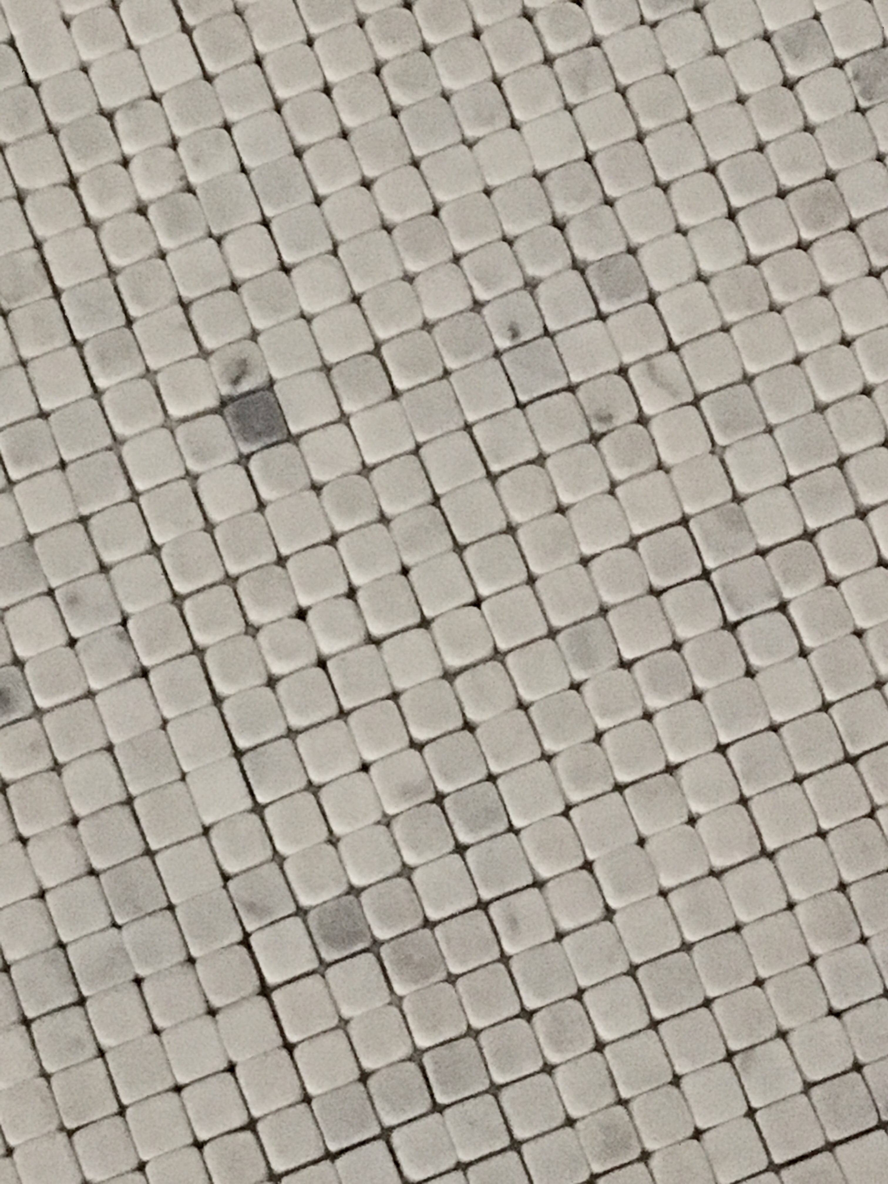 Der Boden: ein Meer. Wasser. Kleine Steine, schillernd in Variationen von weiß und grau. Quadratisch sind die Steine. Und doch an den Kanten gerundet. Wie die Pinselstriche der Bilder. Getupft. Weich. Unregelmäßig und wie durch Zufall komponiert zu einem Ganzen. Und die Steine fassen sich wunderbar an. Edel, zurückhaltend, samtig.
